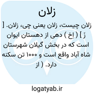 زلان. [ زَ ] ( اِخ ) دهی از دهستان ایوان است که در بخش گیلان شهرستان شاه آباد واقع است و 1000 تن سکنه دارد. ( از فرهنگ جغرافیایی ایران ج 5 ).