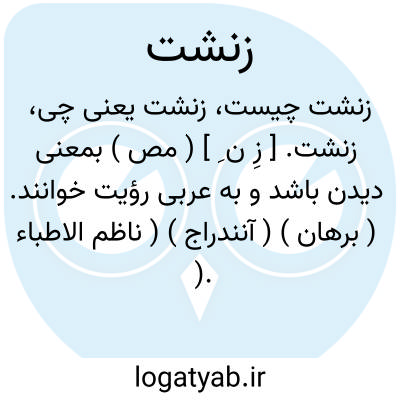 زنشت. [ زِ ن ِ ] ( مص ) بمعنی دیدن باشد و به عربی رؤیت خوانند. ( برهان ) ( آنندراج ) ( ناظم الاطباء ).