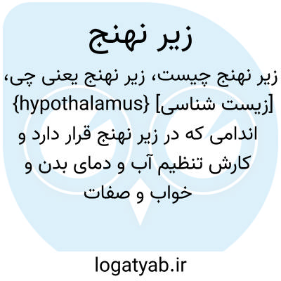 {hypothalamus} [زیست شناسی] اندامی که در زیر نهنج قرار دارد و کارش تنظیم آب و دمای بدن و خواب و صفات ثانوی جنسی است