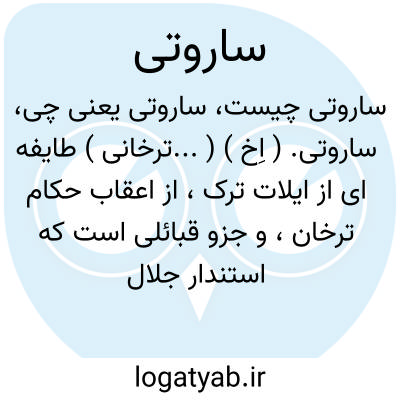 ساروتی. ( اِخ ) (...ترخانی ) طایفه ای از ایلات ترک، از اعقاب حکام ترخان، و جزو قبائلی است که استندار جلال الدین اسکندر [ 731 - 761 ] به ری و شهریار و بسال 809 هَ. ق. میرزا عمر به مازنداران کوچ داد. ( از ترجمه مازندران رابینو ص 202 ).