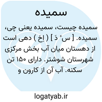 سمیده. [ س ُ دَ ] ( اِخ ) دهی است از دهستان میان آب بخش مرکزی شهرستان شوشتر. دارای 150 تن سکنه. آب آن از کارون و محصول آنجا غلات. شغل اهالی زراعت است. ( از فرهنگ جغرافیائی ایران ج 6 ).