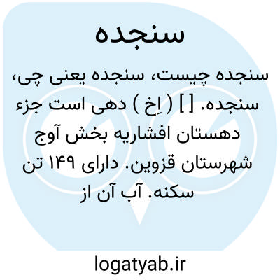 سنجده. [ ] ( اِخ ) دهی است جزء دهستان افشاریه بخش آوج شهرستان قزوین. دارای 149 تن سکنه. آب آن از چشمه سار. محصول آنجا غلات. شغل اهالی زراعت، قالی و جاجیم بافی و راه آن مالرو است. ( از فرهنگ جغرافیائی ایران ج 1 ).