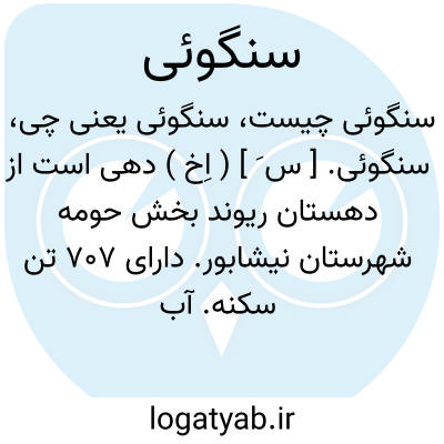 سنگوئی. [ س َ ] ( اِخ ) دهی است از دهستان ریوند بخش حومه شهرستان نیشابور. دارای 707 تن سکنه. آب آن از قنات. محصول آنجا غلات. شغل اهالی زراعت و گله داری است. ( از فرهنگ جغرافیائی ایران ج 9 ).