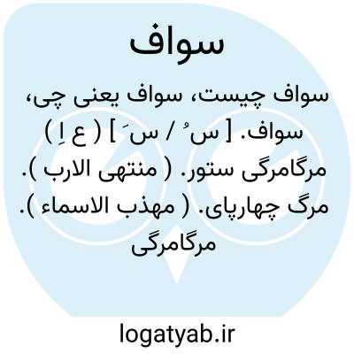 سواف. [ س ُ / س َ ] ( ع اِ ) مرگامرگی ستور. ( منتهی الارب ). مرگ چهارپای. ( مهذب الاسماء ). مرگامرگی مردمان و شتران. ( منتهی الارب ) ( اقرب الموارد ). || ( مص ) هلاکی و هلاک شدن. ( منتهی الارب ).