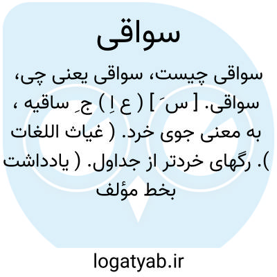 سواقی. [ س َ ] ( ع اِ ) ج ِ ساقیه، به معنی جوی خرد. ( غیاث اللغات ). رگهای خردتر از جداول. ( یادداشت بخط مؤلف ): و سواقی انهاراز ایثار و نثار ازهار پنداری صفایح هندی آبدار است. ( جهانگشای جوینی ). و سواقی و انهار را مساحت نکند و نپیماید. ( تاریخ قم ص 107 ). و درختی که بر کنار جوی یا بر کنار سواقی و اودیه واقع شده باشد آنرا نشمارد. ( تاریخ قم ص 108 ). || ج ِ ساق، بازو.