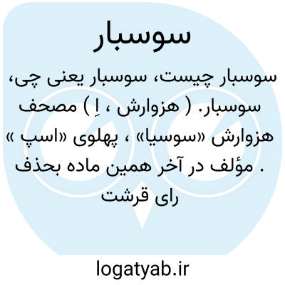 سوسبار. ( هزوارش، اِ ) مصحف هزوارش «سوسیا»، پهلوی «اسپ ». مؤلف در آخر همین ماده بحذف رای قرشت اشاره کرده با «سوبار» ( اسوبار ) به معنی سوار خلط شده. ( ازحاشیه برهان قاطع چ معین ). بلغت زند و پازند اسب را گویند و به عربی فرس خوانند. ( برهان ) ( آنندراج ).