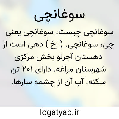 سوغانچی. ( اِخ ) دهی است از دهستان آجرلو بخش مرکزی شهرستان مراغه. دارای 201 تن سکنه. آب آن از چشمه سارها. محصول آنجا غلات، نخود، بزرک. شغل اهالی زراعت و صنایع دستی آنان جاجیم بافی است. ( از فرهنگ جغرافیائی ایران ج 4 ).