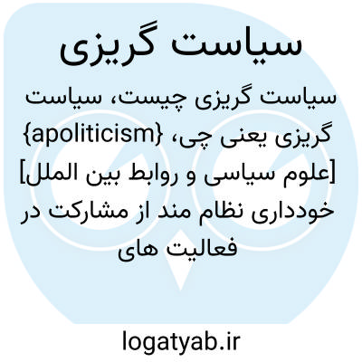 💡 سیاست گریزی (Apolitism)، مفهومی است که ناظر بر لاقیدی در قبال سیاست و مسائل اجتماعی و میهنی، و خودداری از مشارکت در جریانات سیاسی و جلوگیری از اتخاذ مشی سیاسی شفاف است.