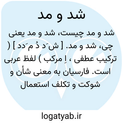 شد و مد. [ ش َد دُ م َدد ] ( ترکیب عطفی، اِ مرکب ) لفظ عربی است. فارسیان به معنی شأن و شوکت و تکلف استعمال نمایند. ( غیاث اللغات ) ( آنندراج ). تأکید و اهمیت. زور و قوت. درشتی و سختی. ( ناظم الاطباء ).