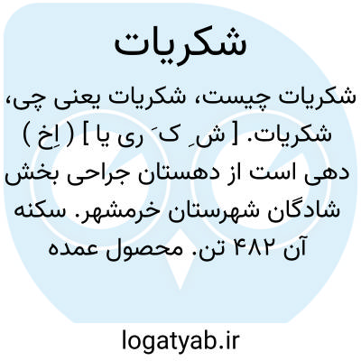 شکریات. [ ش ِ ک َ ری یا ] ( اِخ ) دهی است از دهستان جراحی بخش شادگان شهرستان خرمشهر. سکنه آن 482 تن. محصول عمده غلات است. راه اتومبیل رو دارد. ساکنان از طایفه حمید هستند. ( از فرهنگ جغرافیایی ایران ج 6 ).