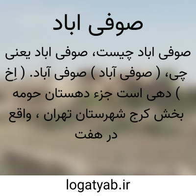 ( صوفی آباد ) صوفی آباد. ( اِخ ) دهی است جزء دهستان حومه بخش کرج شهرستان تهران، واقع در هفت هزارگزی شمال باختر کرج و سه هزارگزی شمالی راه شوسه کرج به قزوین. این دهکده در دامنه واقع و هوای آن معتدل است. 43 تن سکنه دارد. آب آن از قنات و رودخانه کرج. محصول آنجا غلات، بنشن و چغندر قند و دارای باغات میوه، قلمستان است. از راه حصارک میتوان بدانجا اتومبیل برد. بنای قدیمی آن مقبره امامزاده است. ( از فرهنگ جغرافیائی ایران ج 1 ).