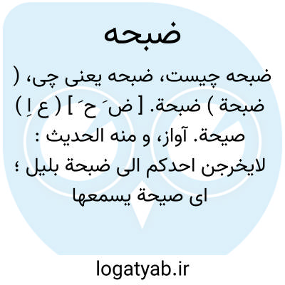 ( ضبحة ) ضبحة. [ ض َ ح َ ] ( ع اِ ) صیحة. آواز، و منه الحدیث: لایخرجن احدکم الی ضبحة بلیل؛ ای صیحة یسمعها فلعله یصیبه مکروه و یروی صبحة. ( منتهی الارب ).