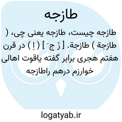 ( طازجة ) طازجة. [ زَ ج َ ] ( اِ ) در قرن هفتم هجری برابر گفته یاقوت اهالی خوارزم درهم راطازجه مینامیده اند و آن بوزن چهار دانگ و نیم بوده.( معجم البلدان ). || درست زر. ج، طوازج.