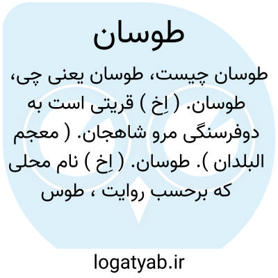 💡 طوسان طوسان (اِخ) نام محلی که برحسب روایت، طوس نوذر سردار کیخسرو ساخت در محلی که کوسان نام داشت و آن در ناحیهٔ پنجاه هزار مازندران است. (کتاب مازندران و استراباد رابینو فصل۷ ص۱۶۰ بخش انگلیسی)