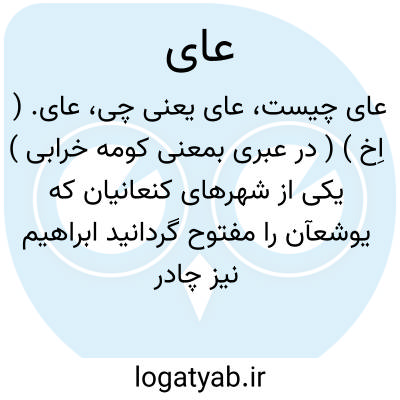 عای. ( اِخ ) ( در عبری بمعنی کومه خرابی ) یکی از شهرهای کنعانیان که یوشعآن را مفتوح گردانید ابراهیم نیز چادر خود را در میانه عای و بیت ایل بر پا نمود و مسافت میانه این دو شهر بقدری بود که امکان داشت کمینگاهی به طرف غربی عای فراهم کرده که مردان و اهالی بیت ایلش نتوانند دید. عای در مشرق بیت ایل و به مسافت نه میل به شمال اورشلیم واقع و محل موضعش فعلاً به خرابه حیان معروف است و عای 38 مرتبه در کتاب مقدس وارد گشته است.