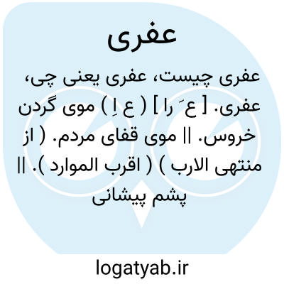 عفری. [ ع َ را ] ( ع اِ ) موی گردن خروس. || موی قفای مردم. ( از منتهی الارب ) ( اقرب الموارد ). || پشم پیشانی ستور. ( منتهی الارب ). موی پیشانی و ناصیه دابه. ( از اقرب الموارد ). || مویهای میانه سر. ( منتهی الارب ). تک مویهایی که در وسط سر انسان روئیده باشد. ( از اقرب الموارد ).