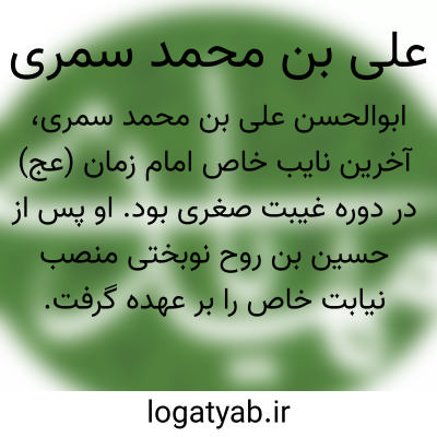 [ویکی شیعه] علی بن محمد سَمَری یا سَمُری (متوفای ۳۲۹ق) چهارمین نائب از نواب اربعه امام زمان(عج) که پس از حسین بن روح نوبختی، سه سال (۳۲۶ - ۳۲۹ق) عهده دار مقام نیابت بود. وی در زمان نیابت، رابط میان حضرت مهدی و شیعیان بود و مردم، وجوه شرعی را در اختیار او می گذاردند. او را از اصحاب امام عسکری هم شمرده اند که مکاتباتی با آن امام داشته است. دوران نیابت سمری کوتاه و نسبت به سه نائب خاص دیگر، کمتر بود و تفصیلی از آن گزارش نشده است. دلیل فعالیت کمتر علی بن محمد سمری، سختگیری حکومت دانسته شده که او را از فعالیت گسترده در سازمان وکالت بازداشت. توقیع امام زمان به علی بن محمد سمری درباره خبر وفات و پایان یافتن دوران نیابت او، از مهمترین اتفاقات این دوره است. با وفات وی، ارتباط مستقیم بین سفیران و امام دوازدهم پایان یافت و دوران غیبت کبری آغاز شد.