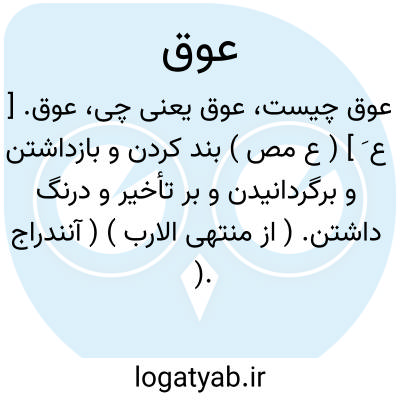 عوق. [ ع َ ] ( ع مص ) بند کردن و بازداشتن و برگردانیدن و بر تأخیر و درنگ داشتن. ( از منتهی الارب ) ( آنندراج ). حبس کردن و بازداشتن و منع کردن وبند نمودن. ( ناظم الاطباء ). منع کردن و منصرف کردن وبه تأخیر واداشتن کسی در امری. ( از اقرب الموارد ). || ماعاقت المراءة عند زوجها و لالاقت؛ نچسبید آن زن به دل شوهر خود. ( ناظم الاطباء ) ( از منتهی الارب ) ( از اقرب الموارد ). و اصل آن چنین بوده است: ماعاقت زوجها عن النظر و المحبة اًلی الغیر و لالاقت عنده؛ آن زن منع نکرد شوی خود را از نگریستن و محبت ورزیدن بدیگران، و نچسبید به وی. ( از اقرب الموارد ).