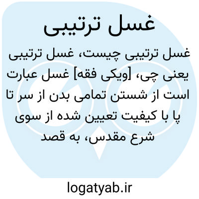 💡 در غسل ترتیبی باید به نیت غسل، نخست سر و گردن، و سپس نیمهٔ راست بدن از بالاکف پا و دست راست و بعد نیمهٔ چپ بدن از گردن تا کف پا و دست چپ را بشوید