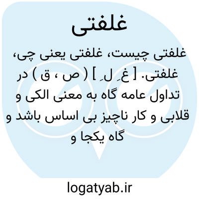 غلفتی. [ غ ِ ل ِ ] ( ص، ق ) در تداول عامه گاه به معنی الکی و قلابی و کار ناچیز بی اساس باشد و گاه یکجا و یکباره معنی دهد چنانکه گویند: پوست سرش راغلفتی بیرون بیاورند. و گویا تصحیفی از کلمه غلاف تازی باشد. || در تداول مردم آذربایجان به معنی حقه باز و دغلکار و متقلب استعمال شود. قلفتی.