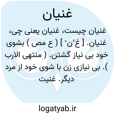 غنیان. [ غ ُن ْ ] ( ع مص ) بشوی خود بی نیاز گشتن. ( منتهی الارب ). بی نیازی زن با شوی خود از مرد دیگر. غنیت المراءة بزوجها عن غیره غنیاناً؛ استغنت. ( اقرب الموارد ). || ( اِمص ) بی نیازی. دستگاه. ( منتهی الارب ). بی نیازی از چیزی. || توانگری. غِنی ̍. غَناء. ( المنجد ). || ( اِ ) چاره. یقال: ما لی عنه غنیان؛ یعنی از وی چاره ندارم. ( از منتهی الارب ).