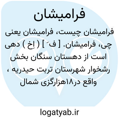 فرامیشان. [ ف َ ] ( اِخ ) دهی است از دهستان سنگان بخش رشخوار شهرستان تربت حیدریه، واقع در18هزارگزی شمال باختری رشخوار. ناحیه ای است واقع درجلگه و گرمسیر. دارای دویست تن سکنه است. از قنات ورودخانه مشروب میشود. محصولش غلات است. اهالی به کشاورزی و گله داری و قالیچه و کرباس بافی گذران میکنند.راه مالرو دارد. ( از فرهنگ جغرافیایی ایران ج 9 ).