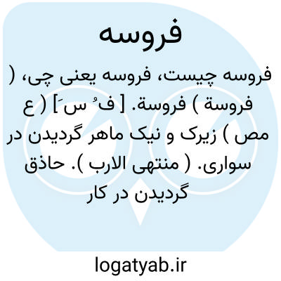 ( فروسة ) فروسة. [ ف ُ س َ] ( ع مص ) زیرک و نیک ماهر گردیدن در سواری. ( منتهی الارب ). حاذق گردیدن در کار خیل. ( اقرب الموارد ). || شناختن اسب و سواری کردن. || ( اِمص ) سواری. || اسب شناسی. ( منتهی الارب ).