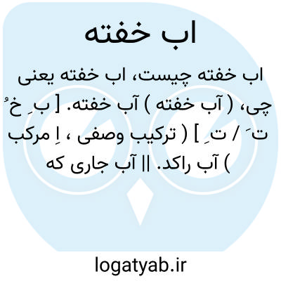 ( آب خفته ) ( اسم ) ۱ - آب راکد آب ایستاده ۲- آب جاری که جریان آن از تراکم آب یا همواری مجری محسوس نباشد. ۳ - ژاله. ۴ - برف. ۵ - تگرگ. ۶ - یخ.۷ - شیشه بلور. ۸ - شمشیر ( در غلاف ).