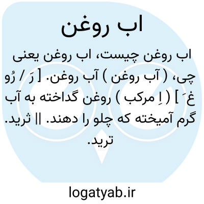 ( آب روغن ) آب روغن. [ رَ / رُو غ َ ] ( اِ مرکب ) روغن گداخته به آب گرم آمیخته که چلو را دهند. || ثرید. ترید. زریقاء. اشکنه.
