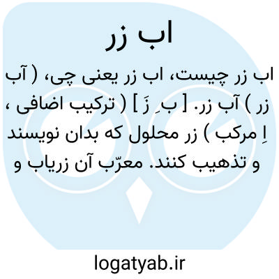 ( آب زر ) ( اسم ) ۱ - آبی که در آن طلا و نقره حل کرده باشند زر محلول که بدان نویسند و تذهیب کنند. ۲ - شراب زعفرانی.