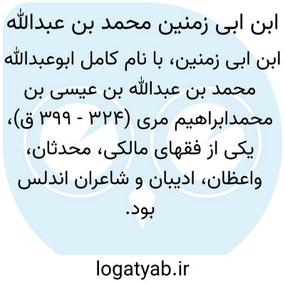 [ویکی نور] ابن ابی زَمَنَیْن، ابوعبدالله محمد بن عبدالله بن عیسی بن محمدابراهیم مُرّی، (324 - 399ق)، فقیه مالکی، محدّث، واعظ، ادیب و شاعر اندلسی است که در البیره زاده شد. ابن بشکوال (458/2)، تبار او را از تَنَس (شهری در الجزایر امروزی) و قاضی عیاض (672/4)، از ناحیه عَدْوه (منطقه ای در مغرب) از قبیله نَفْزَه دانسته است. او نمی دانست که چرا خاندانش به ابن ابی زمنین شهرت یافته اند و دراین باره می گفت: به سبب هیبتی که از پدر بر دل داشتم، جرأت این پرسش را بر خود ندادم.