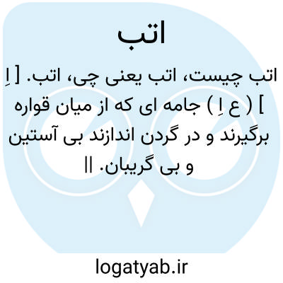 اتب. [ اِ ] ( ع اِ ) جامه ای که از میان قواره برگیرند و در گردن اندازند بی آستین و بی گریبان. || پیراهن بی آستین و بی گریبان. ( مهذب الأسماء ). دواج. شاماکچه. چادری که زنان از میان چاک زده پوشند بی گریبان و آستین. || پیراهن زنان. || هر جامه که کوتاه باشد و تا نصف ساق رسد. ( منتهی الارب ). شلوار بی پایچه. ( منتهی الارب ).تُنُکه. || پیراهن بی آستین. || سینه بند زنان. ( مؤید الفضلاء ). ج، آتاب، اِتاب، اُتوب. || اتب شعیر؛ پوست جو. ( منتهی الارب ).