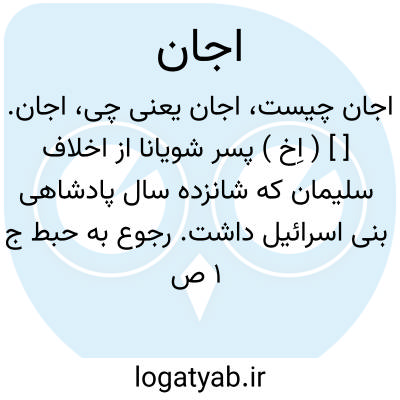 اجان. [ ] ( اِخ ) پسر شویانا از اخلاف سلیمان که شانزده سال پادشاهی بنی اسرائیل داشت. رجوع به حبط ج 1 ص 46 شود.