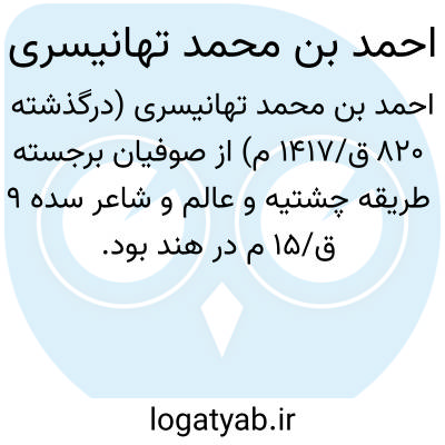[ویکی فقه] تَهانیسَری، احمد بن محمد (د ۸۲۰ ق/۱۴۱۷م)، از صوفیان برجستۀ طریقۀ چشتیه، و عالم و شاعر سدۀ ۹ق/۱۵م در هند بود.