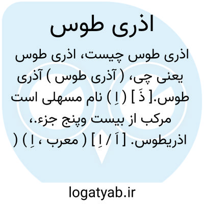 ( آذری طوس ) آذری طوس.[ ذَ ] ( اِ ) نام مسهلی است مرکب از بیست وپنج جزء.، اذریطوس. [ اَ / اِ ] ( معرب، اِ ) ( معرّب از رومیّه ). ( منتهی الارب ). دوائی است مُسهل یا دوائی است برای حفظ و گویند مرکبی است از بیست وپنج جزو.