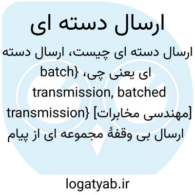 {batch transmission, batched transmission} [مهندسی مخابرات] ارسال بی وقفۀ مجموعه ای از پیام ها از پایانۀ مبدأ به پایانۀ مقصد، بی آنکه در حین ارسال، پیامی در مسیر برگشت مبادله شود