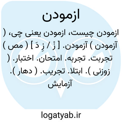 ( آزمودن ) آزمودن. [ زْ / زِ دَ ] ( مص ) تجربت. تجربه. امتحان. اختبار. ( زوزنی ). ابتلا. تجریب. ( دهار ). آزمایش کردن. تدریب. بلاء. ( ادیب نطنزی ). بلا. بلو. ابلا. تجریس.بور. ابتیار. احتناک. سنجیدن. خبرت. ( دهار ). سبر. فتنه. افتتان. وارسی کردن. تمحیص. تضریس: