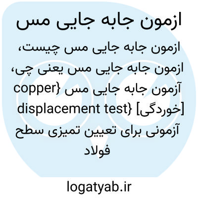 {copper displacement test} [خوردگی] آزمونی برای تعیین تمیزی سطح فولاد با غوطه ور کردن فلز در محلول مس سولفات که در آن در نقاط فاقد آلودگی سطح فلز پوشش یکنواختی از مس می نشیند