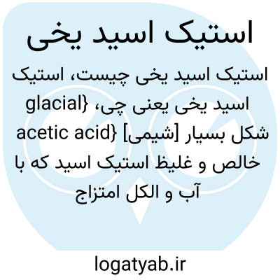{glacial acetic acid} [شیمی] شکل بسیار خالص و غلیظ استیک اسید که با آب و الکل امتزاج پذیر است و در16/6 درجۀ سلسیوس ذوب می شود و در 118 درجۀ سلسیوس جوش می آید