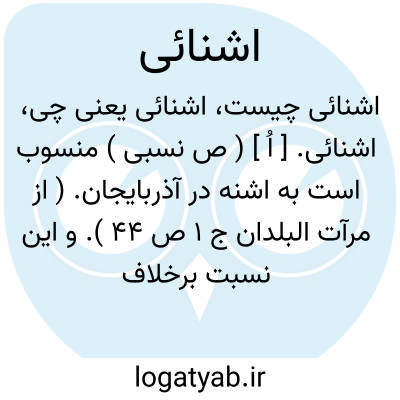 اشنائی. [ اُ ] ( ص نسبی ) منسوب است به اشنه در آذربایجان. ( از مرآت البلدان ج 1 ص 44 ). و این نسبت برخلاف قیاس است. ( معجم البلدان ).