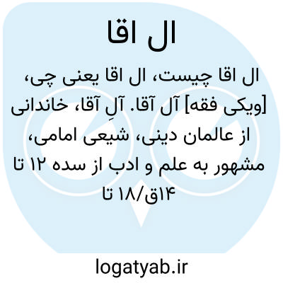 [ویکی فقه] آل آقا. آلِ آقا، خاندانی از عالمان دینی، شیعی امامی، مشهور به علم و ادب از سده ۱۲ تا ۱۴ق/۱۸ تا ۲۰م در ایران می باشد.
