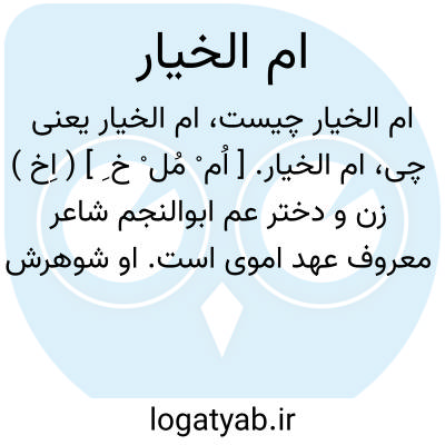 ام الخیار. [ اُم ْ مُل ْ خ ِ ] ( اِخ ) زن و دختر عم ابوالنجم شاعر معروف عهد اموی است. او شوهرش را بسبب پیری و ضعف و ناتوانی طعن میکرده و این موضوع در اشعار ابوالنجم انعکاس یافته است. رجوع به ریحانة الادب ج 6 ص 219 و خیرات حسان ج 1 ص 44 شود.