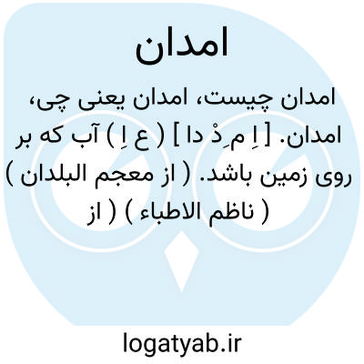 امدان. [ اِ م ِدْ دا ] ( ع اِ ) آب که بر روی زمین باشد. ( از معجم البلدان ) ( ناظم الاطباء ) ( از آنندراج ). || آب نمک یا آب شور. ( از اقرب الموارد ). آب سخت شور. ( مؤید الفضلا ) ( آنندراج ). از زیدالخیل است: