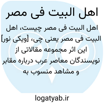 [ویکی شیعه] اهل البیت فی مصر (کتاب). أهْلُ البَیْت فی مِصْر مجموعه مقالاتی به زبان عربی، از برخی نویسندگان معاصر عرب بوده که سید هادی خسروشاهی آن را گردآوری کرده است. این اثر درباره مقابر و مشاهد منسوب به خاندان پیامبر(ص) در کشور مصر است. اهل البیت فی مصر علاوه بر آنکه عشق و علاقه مصری ها به اهل بیت(ع) را نشان داده، راهنمایی برای مراقد اهل بیت و تاریخ و معماری آن ها به شمار می آید. مقالات این مجموعه از منابع مختلفی گرفته شده اند.