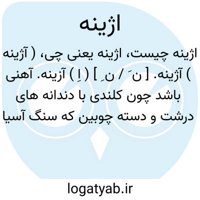 ( آژینه ) آژینه. [ ن َ / ن ِ ] ( اِ ) آزینه. آهنی باشد چون کلندی با دندانه های درشت و دسته چوبین که سنگ آسیا را از درون سوی بدان نقر کنند تا دانه بهتر خرد کند. آسیازَنه. آس افزون. آس افژون. منقار. مِکْوَس. میقعه. بِرطیل. آسیاآژن.