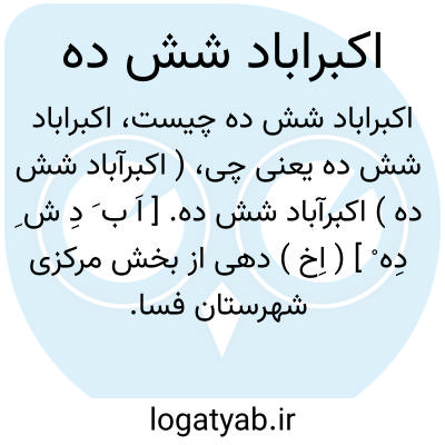( اکبرآباد شش ده ) اکبرآباد شش ده. [ اَ ب َ دِ ش ِ دِه ْ ] ( اِخ ) دهی از بخش مرکزی شهرستان فسا. سکنه آن 625 تن و آب آن از چاه و محصول عمده آنجا غلات و حبوب و پنبه و صنایع دستی زنان گلیم بافی است. ( از فرهنگ جغرافیایی ایران ج 7 ).