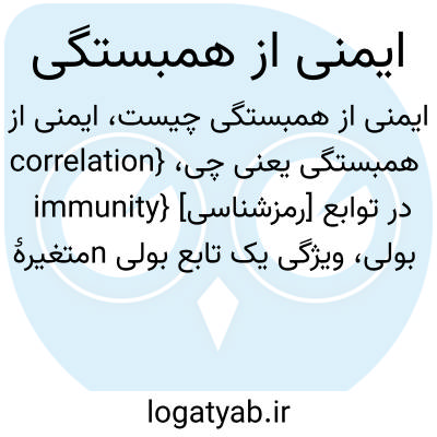 {correlation immunity} [رمزشناسی] در توابع بولی، ویژگی یک تابع بولی nمتغیرۀ f، هرگاه اطلاعات متقابل بین خروجی و همۀ زیربُردارهای kتایی از متغیرهای ورودی صفر باشد