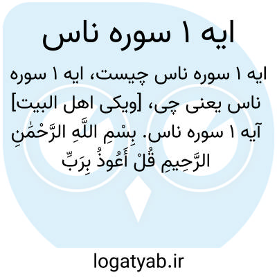 [ویکی اهل البیت] آیه 1 سوره ناس. بِسْمِ اللَّهِ الرَّحْمَٰنِ الرَّحِیمِ قُلْ أَعُوذُ بِرَبِّ النَّاسِ بگو: من پناه می جویم به پروردگار آدمیان. بگو: پناه می برم به پروردگار مردم بگو: «پناه می برم به پروردگار مردم، بگو: به پروردگار مردم پناه می برم، بگو: پناه می برم به پروردگار مردم، Say, "I seek refuge in the Lord of mankind, Say: I seek refuge with the Lord and Cherisher of Mankind,