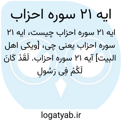 [ویکی اهل البیت] آیه 21 سوره احزاب. لَقَدْ کَانَ لَکُمْ فِی رَسُولِ اللَّهِ أُسْوَةٌ حَسَنَةٌ لِمَنْ کَانَ یَرْجُو اللَّهَ وَالْیَوْمَ الْآخِرَ وَذَکَرَ اللَّهَ کَثِیرًا