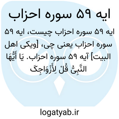 [ویکی اهل البیت] آیه 59 سوره احزاب. یَا أَیُّهَا النَّبِیُّ قُلْ لِأَزْوَاجِکَ وَبَنَاتِکَ وَنِسَاءِ الْمُؤْمِنِینَ یُدْنِینَ عَلَیْهِنَّ مِنْ جَلَابِیبِهِنَّ ۚ ذَٰلِکَ أَدْنَیٰ أَنْ یُعْرَفْنَ فَلَا یُؤْذَیْنَ ۗ وَکَانَ اللَّهُ غَفُورًا رَحِیمًا